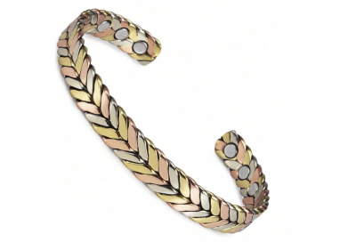 Questo raffinato braccialetto in rame con inserti intrecciati dorati e rosati unisce l’eleganza del design ai benefici per il corpo e la mente. Dotato di magneti posizionati alle estremità, è un accessorio ideale per chi ama i gioielli con un tocco di significato terapeutico ed energetico.
