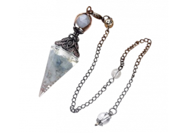 All'interno del pendolo spiccano frammenti di acquamarina, una pietra preziosa dal colore delicato e cristallino che richiama le acque pure di un lago incontaminato. La pietra è sospesa in una matrice di resina trasparente, creando un effetto visivo affascinante e armonioso. L'acquamarina, con le sue sfumature azzurre, amplifica le vibrazioni positive e porta con sé una sensazione di calma e serenità.