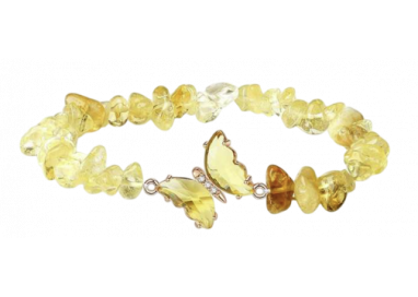 Le pietre di quarzo citrino, dal caratteristico colore giallo dorato, sono montate su un bracciale elastico comodo da indossare, impreziosito da una farfalla centrale che cattura la luce con eleganza. La composizione armoniosa delle tonalità calde e dei riflessi solari crea un accessorio femminile, raffinato e pieno di vitalità.