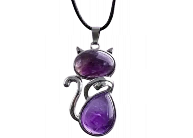 Realizzato in pietra naturale di ametista, delicatamente incastonata nella forma di un gatto stilizzato, questo ciondolo emana una luce viola tenue e avvolgente.