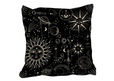 Il cuscino presenta un fondale nero intenso, che funge da perfetto sfondo per i dettagli in tonalità oro e crema. Il sole e la luna, protagonisti assoluti, rappresentano l’equilibrio tra luce e ombra, giorno e notte, energia e calma. I pianeti e costellazioni che lo circondano aggiungono un tocco di magia, richiamando il mistero dell’universo infinito. Perfetto per chi ama il design etereo e il simbolismo spirituale.