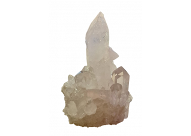 Questo cluster di quarzo ialino è una formazione cristallina, caratterizzata da una punta centrale dominante circondata da cristalli più piccoli che crescono armoniosamente alla base. La sua struttura lo rende non solo esteticamente suggestivo, ma anche uno strumento energetico potente, ideale per ambienti e pratiche olistiche.