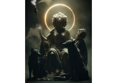 In questa potente stampa su canvas, l’artista Lino Moretti dà forma a una visione solenne e magnetica di Hecate, una delle divinità più antiche, complesse e misteriose del pantheon greco. La dea appare triforme, seduta in una posa regale e immobile, come sospesa tra i mondi. Il suo corpo è uno solo, ma tre volti emergono in direzioni diverse: simbolo del dominio sui crocicchi, sui passaggi, sul tempo (passato, presente e futuro) e sui confini tra vita, morte e aldilà.