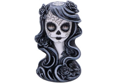 La scultura raffigura una donna elegantemente truccata secondo la tradizione del Giorno dei Morti, dando vita a una figura audace, enigmatica e aggraziata. Il risultato è un equilibrio perfetto tra bellezza malinconica e fascino oscuro, capace di catturare immediatamente lo sguardo.
