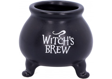 Questo vasetto a forma di calderone nero delle streghe presenta l'inscrizione "Witch's Brew" (Birra della strega).