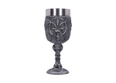 Questo calice occulto presenta su ogni lato la testa di una capra sabbatica a tre corna con un pentagramma sollevato dal cranio.