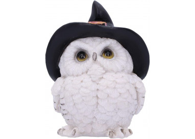 Un gufo cornuto bianco siede pazientemente su un cappello da strega. Il suo nome è Soren, come il famoso gufo guardiano. Questa statuina è...