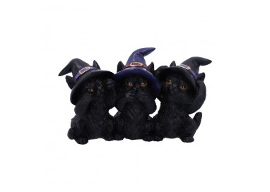 Seduti fianco a fianco con un cappello da strega su ciascuna delle loro teste, questi tre saggi gattini guardano in alto con occhi adorabili. Uno stringe le zampe alla bocca, uno blocca le orecchie e uno copre gli occhi, dando una sbirciatina a prescindere.